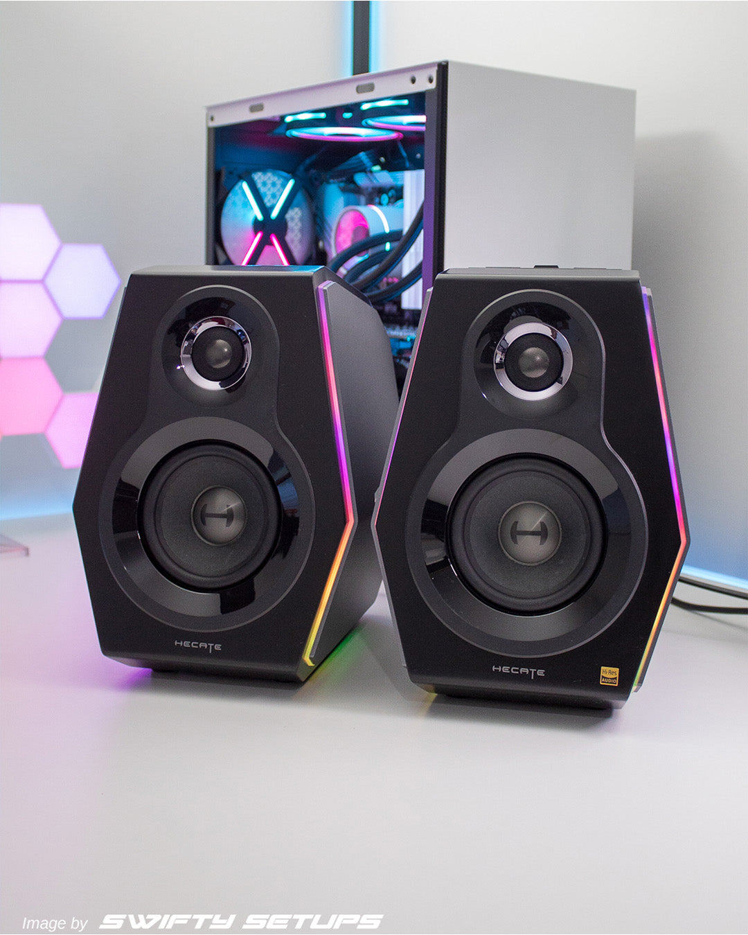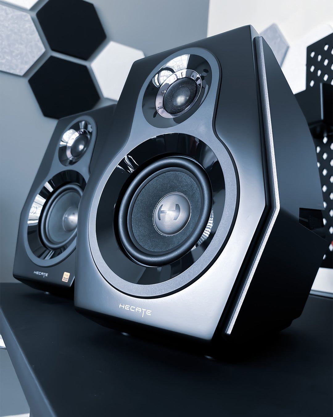 Placez les enceintes sur une surface solide et stable, parallèle à la hauteur des oreilles de l'auditeur, et la distance entre le trou bass-reflex et le mur doit être d'au moins 20 à 50 cm. Pour un son et un équilibre optimaux, l'emplacement idéal pour l'auditeur doit se situer sur l'axe du triangle équilatéral formé par les enceintes gauche et droite. Vous pouvez également ajuster légèrement l'angle de l'enceinte pour obtenir un effet stéréo optimal.