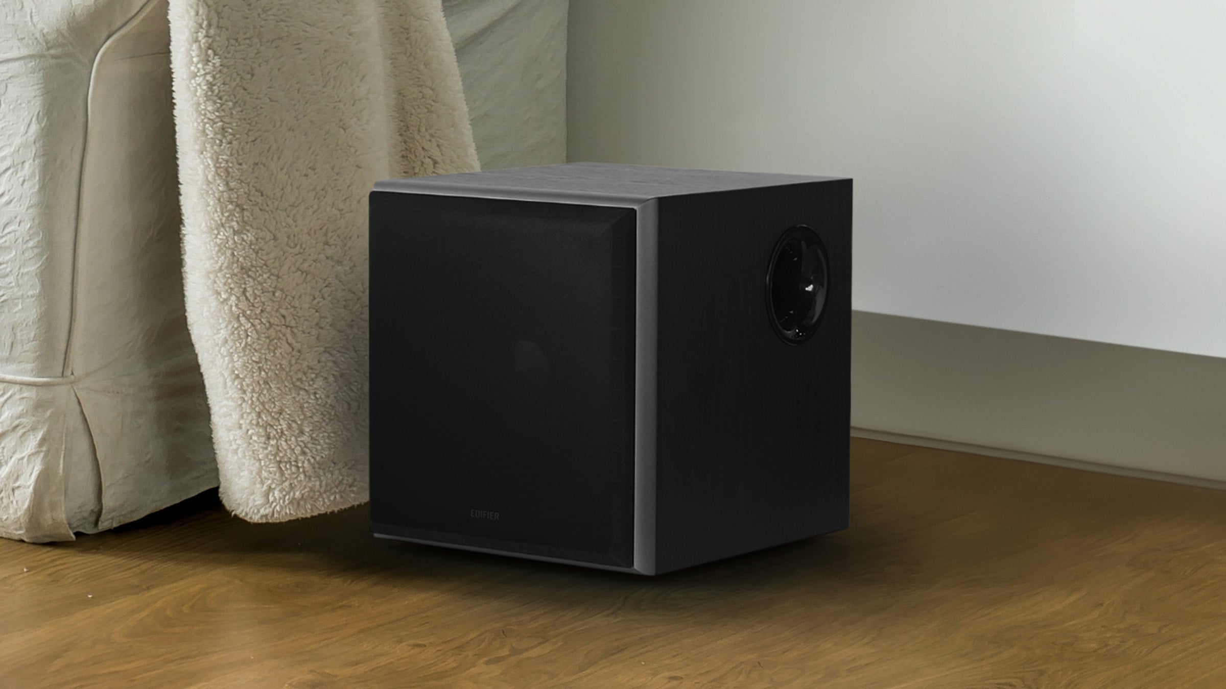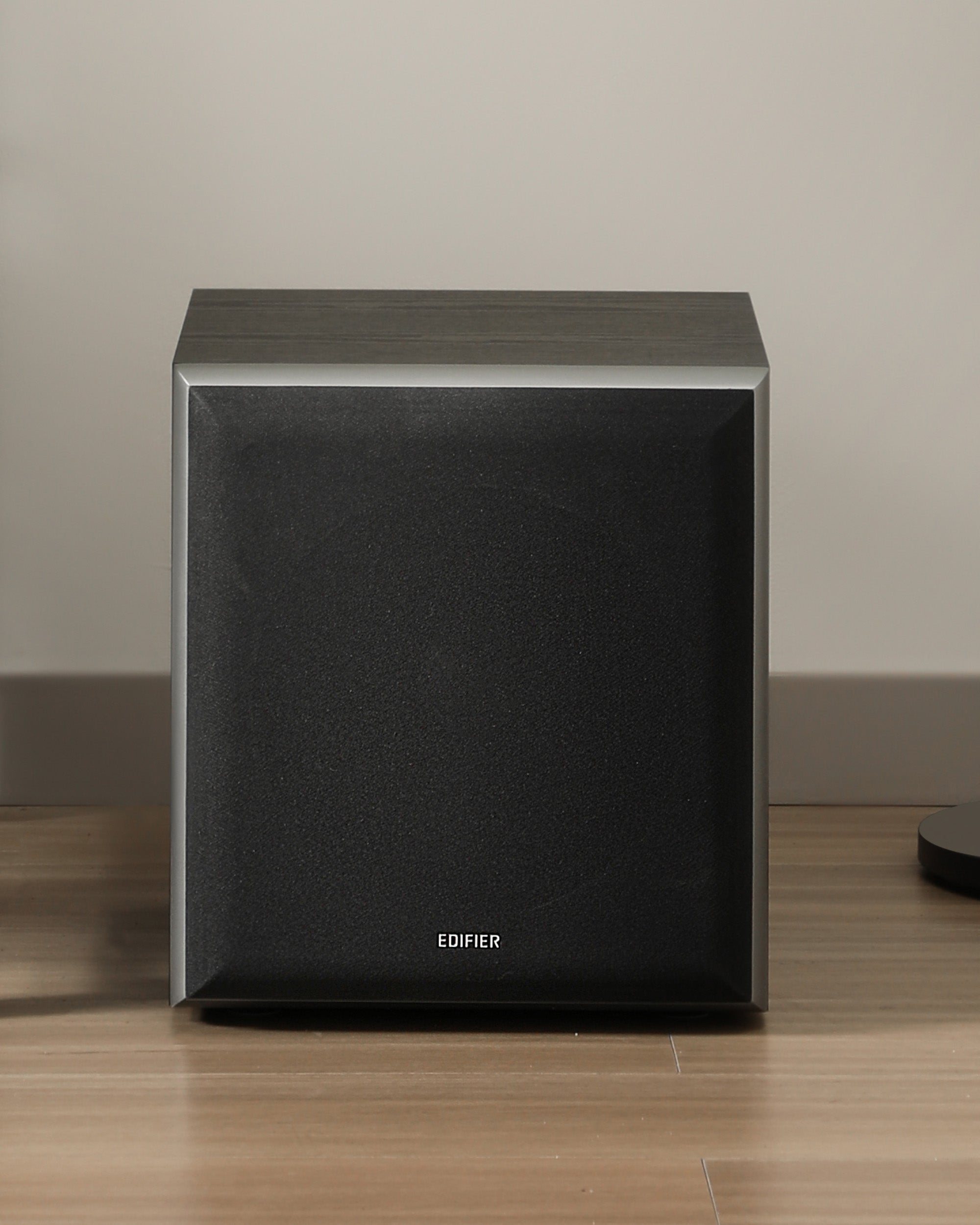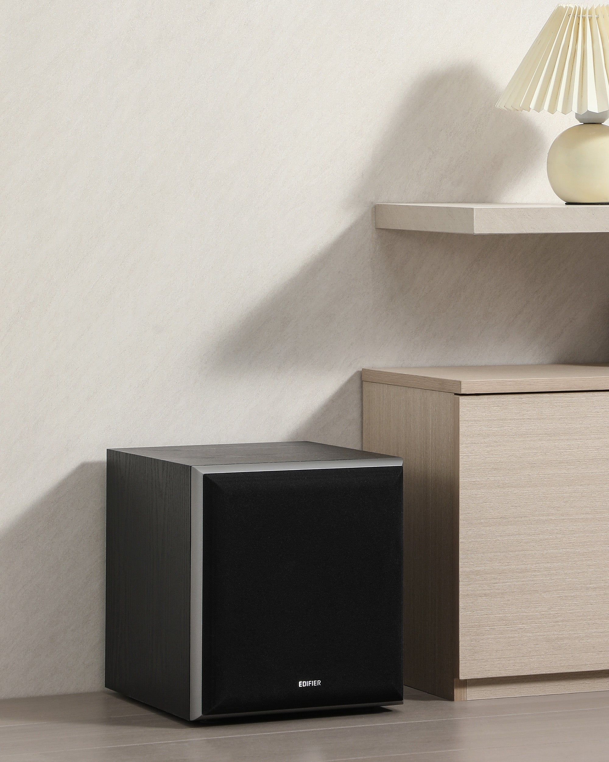 - Wood-grain MDF enclosure blends naturally with modern interiors