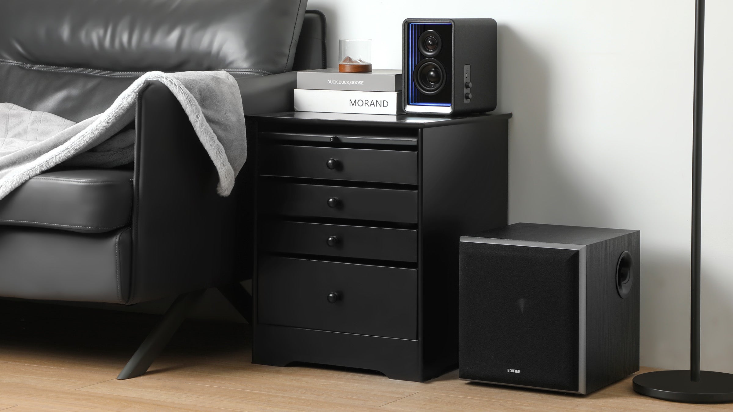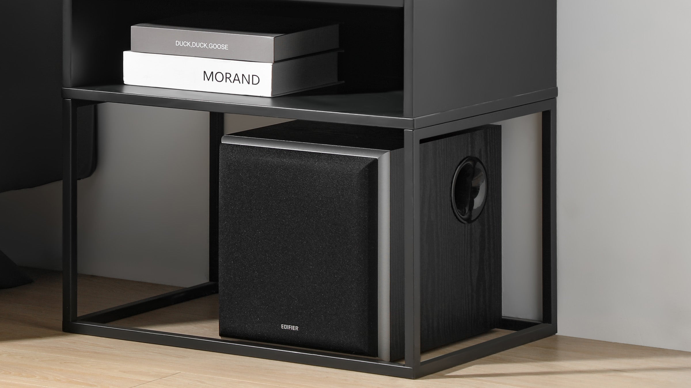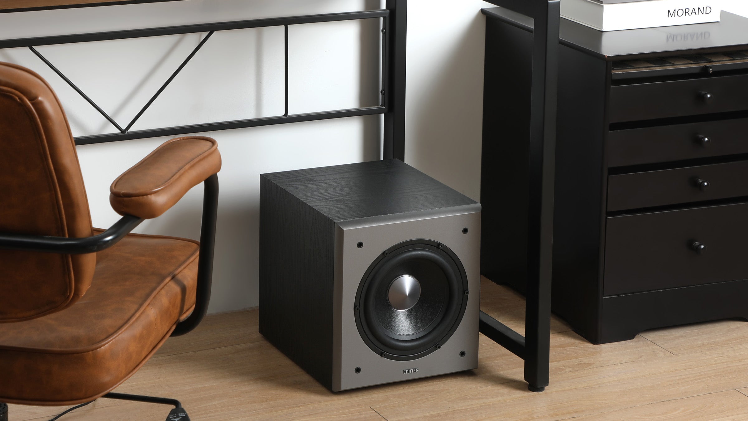 - Wood-grain MDF enclosure blends naturally with modern interiors